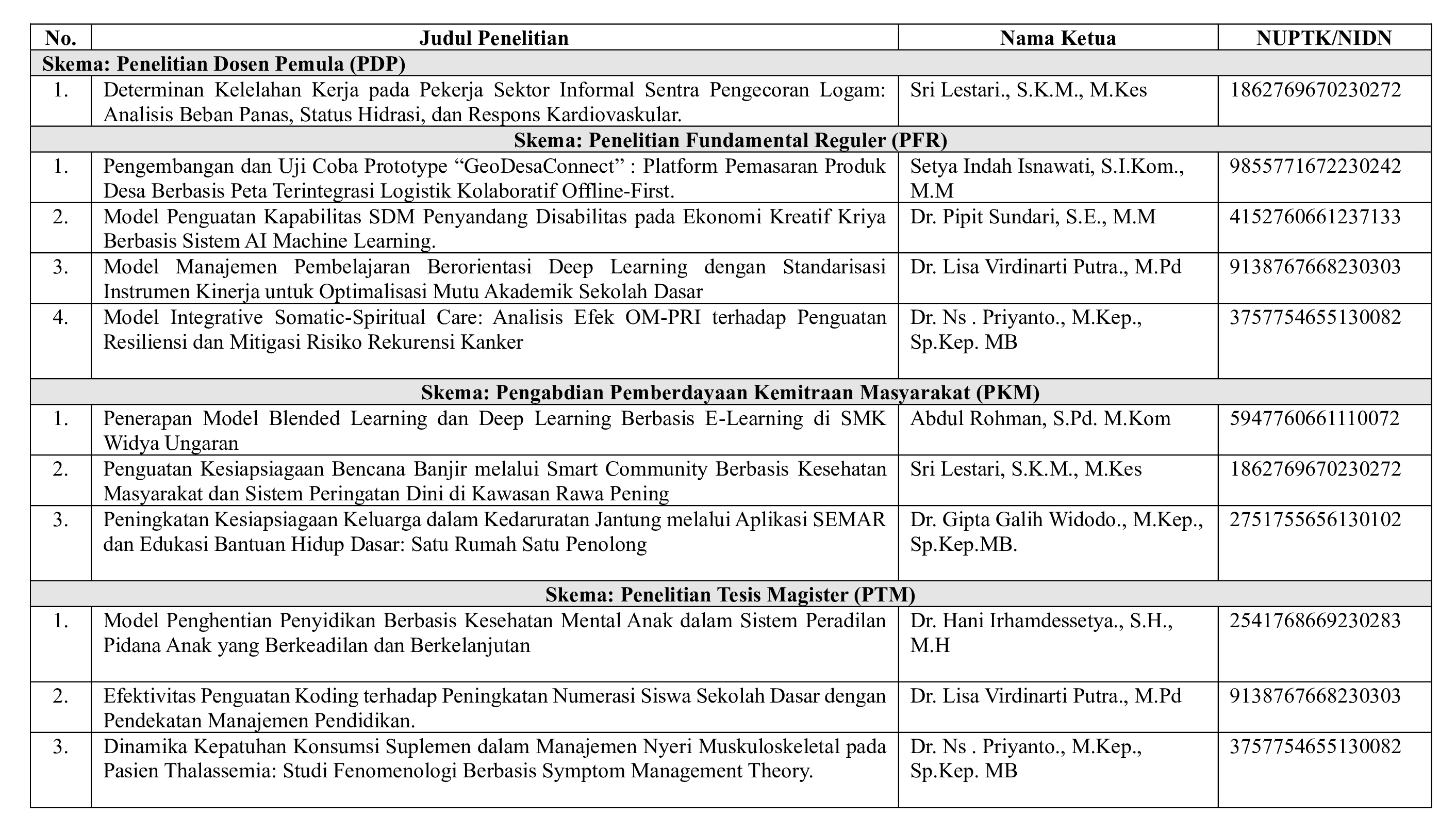 Universitas Ngudi Waluyo mengucapkan selamat dan sukses kepada para dosen peneliti yang berhasil memperoleh pendanaan Riset dan Pengembangan Tahun Anggaran 2026. Capaian ini diharapkan dapat semakin memperkuat budaya akademik berbasis riset, mendorong lahirnya inovasi yang aplikatif, serta memberikan kontribusi nyata bagi masyarakat dan pembangunan nasional. Universitas juga berharap keberhasilan ini menjadi motivasi bagi seluruh civitas akademika untuk terus meningkatkan kualitas penelitian, memperluas kolaborasi, dan menghasilkan karya ilmiah yang berdampak luas serta berkelanjutan.