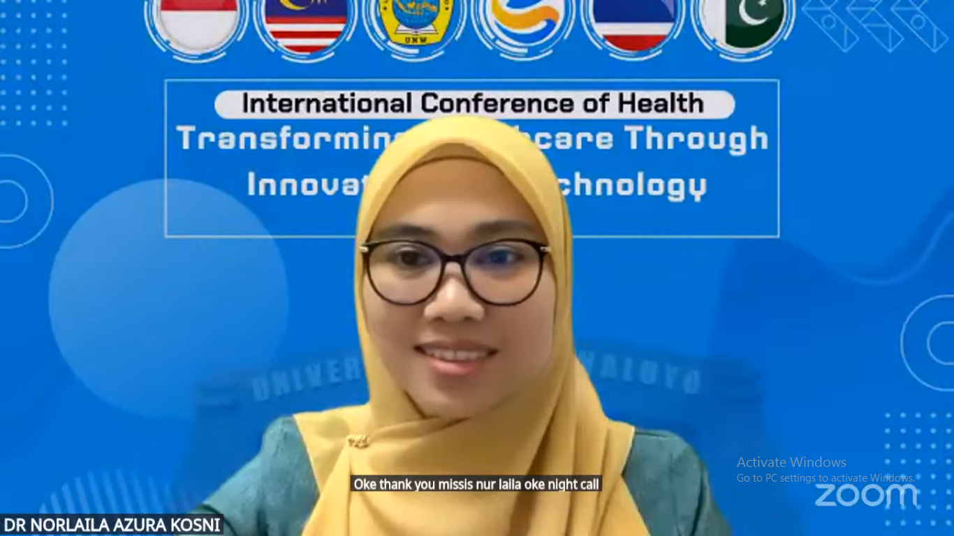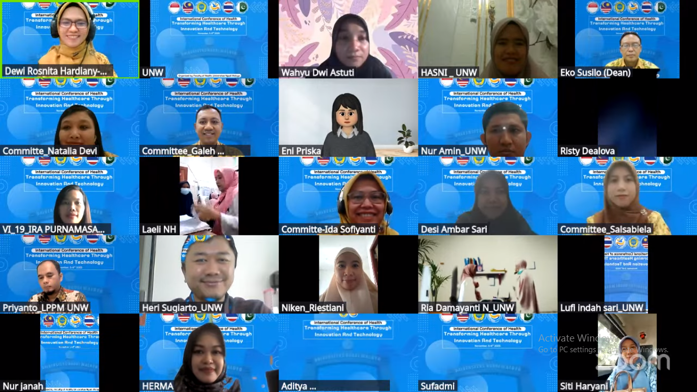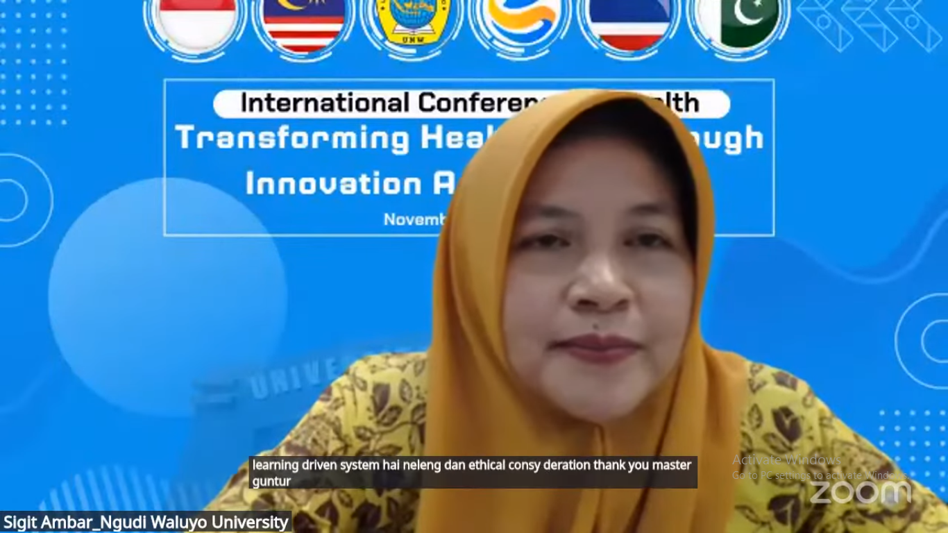 Konferensi ini menghadirkan lima narasumber internasional dengan reputasi akademik dan penelitian yang mumpuni. Pada hari pertama, para narasumber menyampaikan materi dalam agenda Virtual International Conference on Health (VICoH) ke-2, dengan topik-topik menarik yang mencerminkan kemajuan riset dan inovasi global. Para narasumber yang hadir dalam konferensi ini antara lain Dr. Sigit Ambar Widyawati, SKM., M.Kes., Vice Rector of Universitas Ngudi Waluyo, Indonesia, yang membawakan materi berjudul Utilization of Health Technology Innovation for Early Detection and Personal Education. Kemudian, Dr. Norlaila Azura Binti Kosni, Ph.D. dari Technology MARA University, Malaysia, memaparkan topik Personalized Training Workload for Badminton Single Player Based on Match Analysis. Selanjutnya, Dr. Muhammad Ajmal Shah dari Hazara University, Pakistan, menyampaikan materi tentang Green Innovation in Phytomedicines. Adapun Prof. Dr. Hamid Jan Bin Jan Mohamed dari Malaysia membahas Innovation Program for Anticipating Obesity, dan Assoc. Prof. Dr. Susheewa Wichaikull, Ph.D. dari Boromarajonani College of Nopparat Vajira Nursing College, Thailand, mempresentasikan Innovation and AI for Nursing Education and Nursing Services in Thailand.