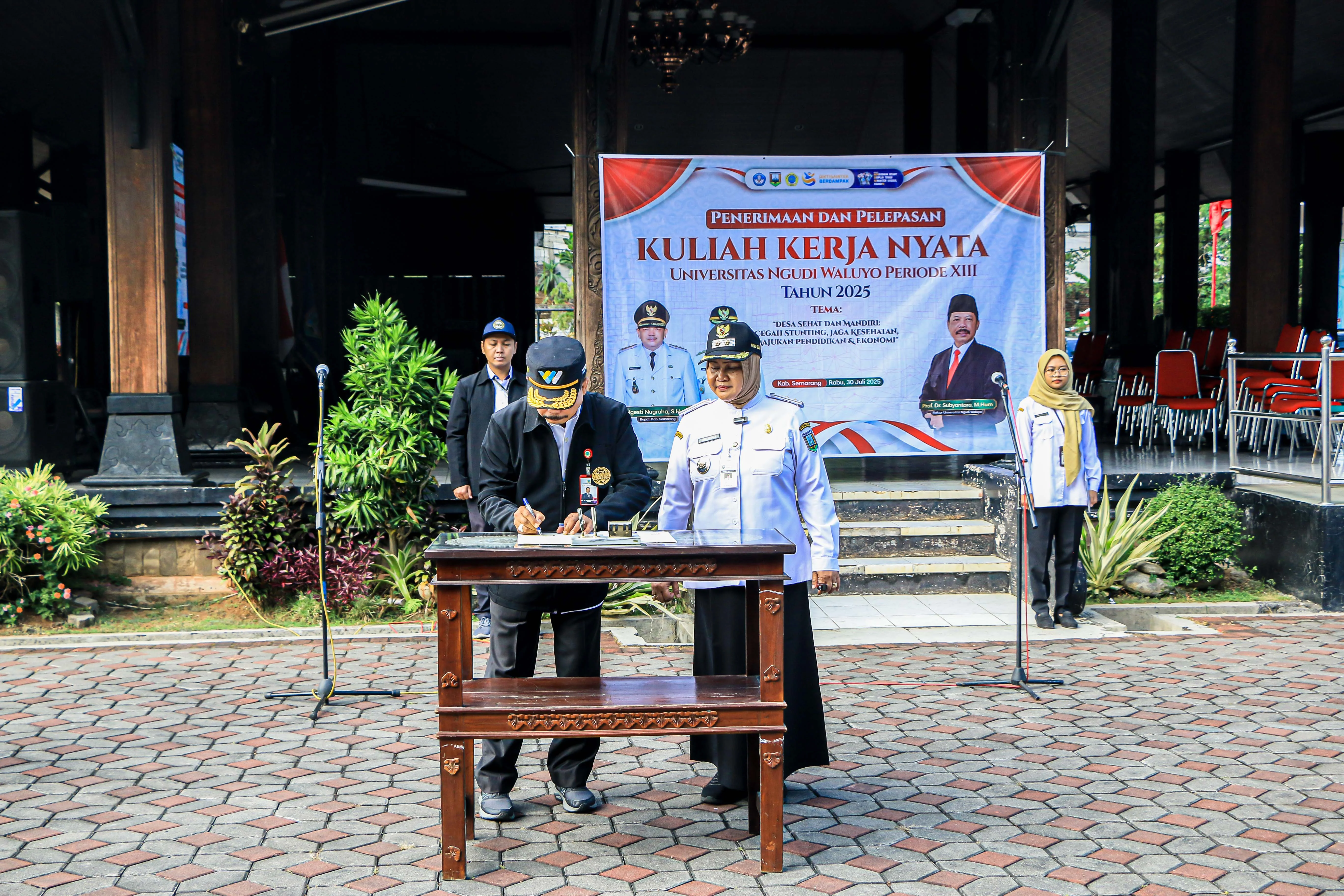 Acara dilanjutkan dengan penandatanganan penerimaan KKN oleh Rektor UNW dan Wakil Bupati Semarang, serta penyematan jaket KKN secara simbolis. Melalui pelepasan mahasiswa yang telah dilakukan ini, diharapkan mahasiswa dapat mengaplikasikan ilmu yang telah dipelajari di bangku kuliah, mampu beradaptasi dengan berbagai situasi di lapangan, dan mampu memberikan kebermanfaatan untuk masyarakat Kabupaten Semarang pada khususnya.