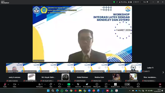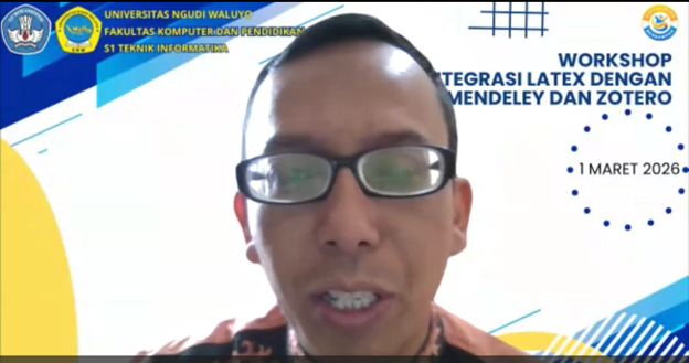 UNGARAN – Dalam upaya meningkatkan standar penulisan karya ilmiah dan efisiensi manajemen referensi bagi mahasiswa, Program Studi S1 Teknik Informatika Universitas Ngudi Waluyo (UNW) menyelenggarakan workshop bertajuk “Integrasi LaTeX dengan Mendeley dan Zotero” pada Minggu, 1 Maret 2026. Kegiatan yang dilaksanakan secara daring melalui platform virtual meeting ini diikuti dengan antusias oleh seluruh mahasiswa Teknik Informatika UNW. Workshop ini dirancang khusus untuk membekali mahasiswa dengan keterampilan teknis dalam mengelola sitasi dan menyusun dokumen ilmiah yang terstandarisasi secara internasional.