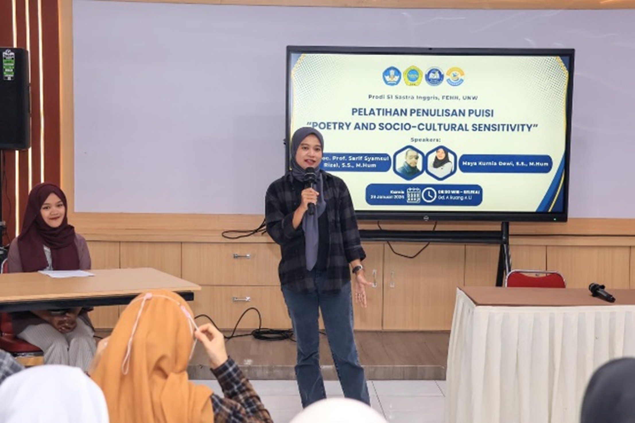 Ungaran, 29 Januari 2025 - Program Studi Sastra Inggris Universitas Ngudi Waluyo (UNW) sukses menyelenggarakan pelatihan penulisan puisi bertajuk “Poetry and Socio-Cultural Sensitivity” pada Kamis (29/1) di Gedung A, Ruang A.1.1 Universitas Ngudi Waluyo. Kegiatan ini dirancang untuk mengembangkan kemampuan menulis puisi yang peka terhadap isu sosial dan kultural sekaligus menjadi ruang reflektif bagi peserta. Pelatihan ini menegaskan bahwa puisi tidak hanya berfungsi sebagai karya seni yang bersifat aesthetic, tetapi juga sebagai media ekspresi yang efektif dalam merepresentasikan realitas sosial dan nilai-nilai budaya. Melalui kegiatan ini, peserta diharapkan mampu meningkatkan keterampilan literasi sastra sekaligus memperluas perspektif kritis terhadap fenomena sosial.