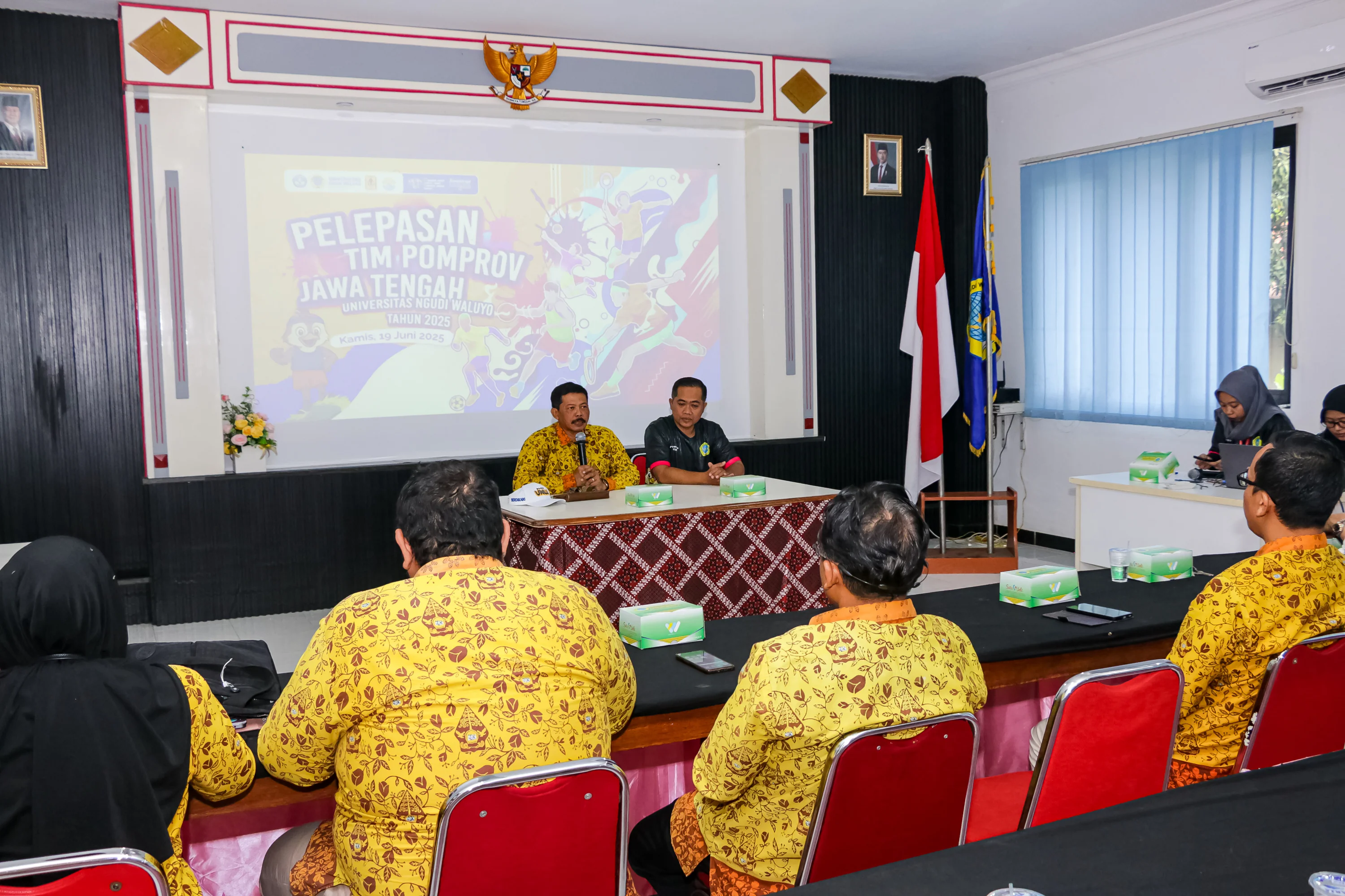 Ungaran 19/06/2025 – Rektor Universitas Ngudi Waluyo secara resmi melepas kontingen atlet mahasiswa untuk mengikuti ajang Pekan Olahraga Mahasiswa Provinsi (POMPROV) Jawa Tengah Tahun 2025. Acara pelepasan dipimpin langsung oleh Rektor UNW, Prof. Dr.Subyantoro, M.Hum., didampingi oleh Dekan F.Kes, Wakil Dekan FEHH, Wakil Dekan FKP, Kaprodi, Kabiro BKPP, Tim Kemahasiswaan, pelatih, dan Pendamping atlet.