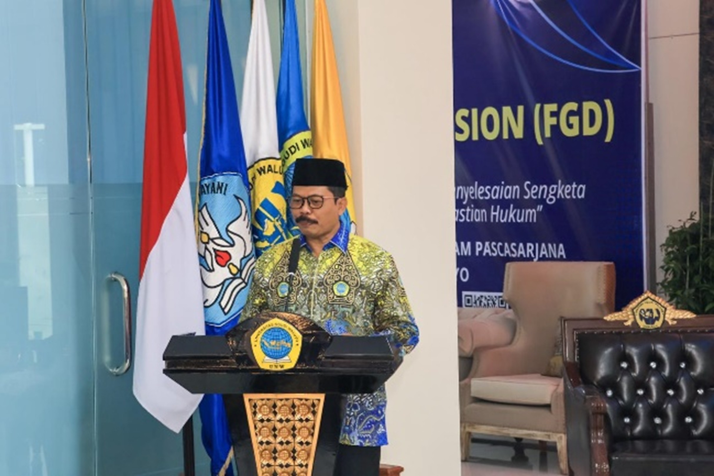 Mewakili Bupati Semarang, Kepala Dinas Pendidikan, Kebudayaan, Kepemudaan dan Olahraga Kabupaten Semarang, M. Taufiqur Rahman, S.Ag., M.Si., menyampaikan sambutan dan apresiasi atas inisiatif Program Pascasarjana UNW yang telah membuka ruang diskusi strategis lintas sektor. Dalam sambutan Bupati Semarang yang disampaikannya, ditegaskan bahwa pemberdayaan masyarakat desa merupakan subjek utama pembangunan yang harus terus didukung secara berkelanjutan. Upaya tersebut diarahkan untuk memperkuat kemandirian desa, meningkatkan kualitas sumber daya manusia, mendorong ekonomi kreatif, serta meningkatkan kesejahteraan masyarakat secara menyeluruh.