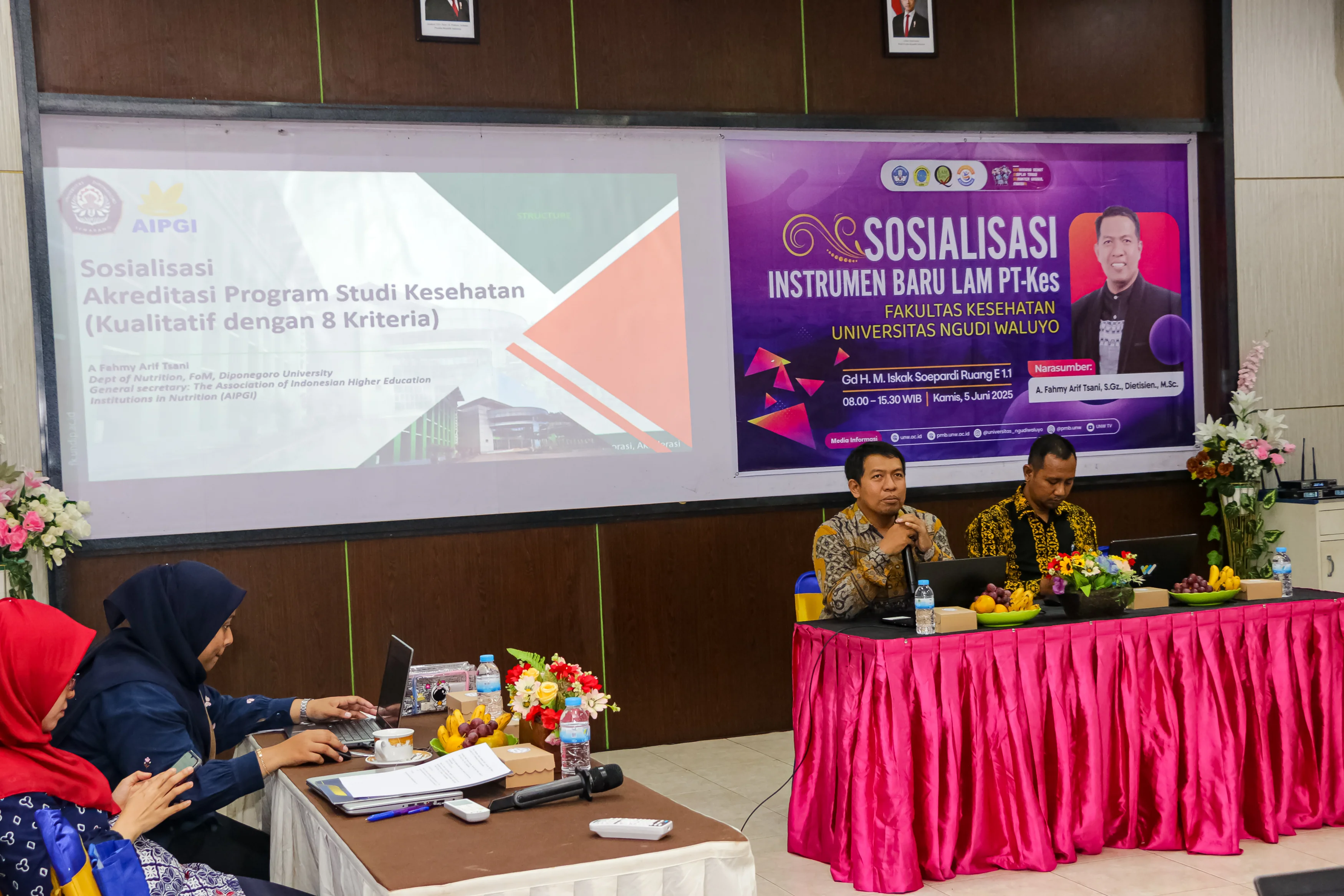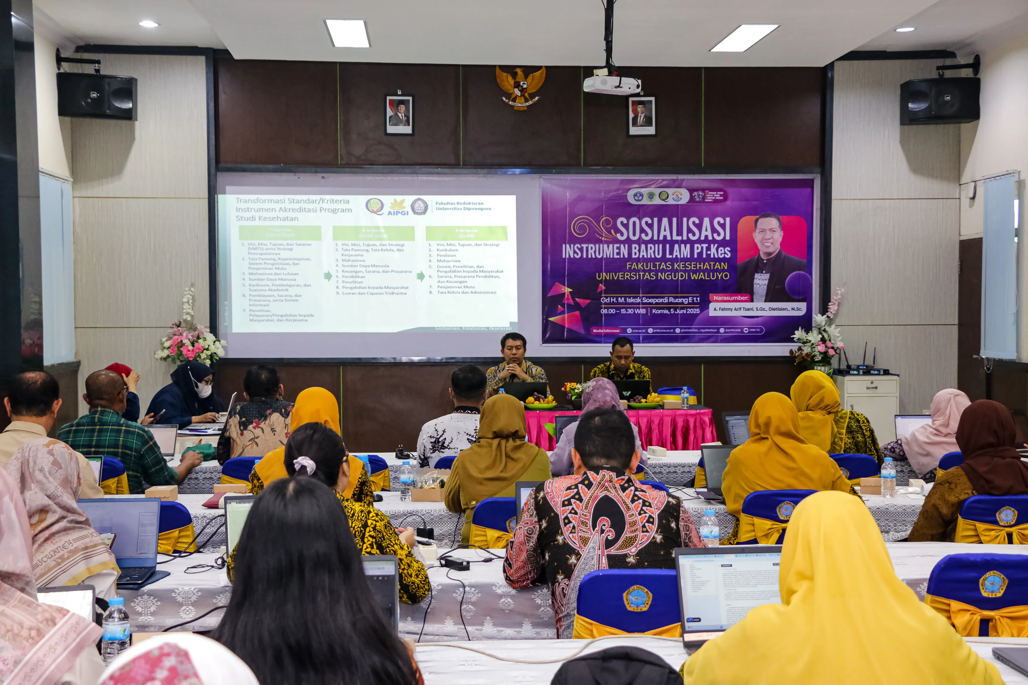Ungaran, 5 Juni 2025 telah berlangsung kegiatan Sosialisasi Instrumen Baru Akreditasi LAM PT-Kes yang berlangsung di ruang E 1.1 Gd H. M. Iskak Soepatrdi Universitas Ngudi Waluyo (UNW). Kegiatan tersebut diawali dengan sambutan yang disampaikan oleh Bapak Eko Susilo, S.Kep., Ns., M.Kep. selaku Dekan Fakultas Kesehatan, dalam sambutannya beliau mengapresiasi kegiatan yang berlangsung, dengan harapan seluruh program studi kesehatan yang hadir dalam kegiatan tersebut dapat mengambil manfaat dari kegiatan yang berlangsung, serta dengan perubahan instrumen akreditasi diharapkan program studi perlu mempersiapkan akreditasi secara maksimal dalam mempersiapkan dokumen yang dibutuhkan untuk mencapai hasil optimal. Dilanjutkan dengan sambutan oleh Ibu Heni Setyowati, S.Si.T., M.Kes. selaku Ka. Badan Penjaminan Mutu (Ka. BPM) yang menyampaikan bahwa perlunya adaptasi pada instrumen baru yang baru saja diluncurkan berupa instrument kualitatif dengan 8 kriteria, sehingga prodi kesehatan yang akan mengajukan akreditasi perlu mempersiapkan secara maksimal.