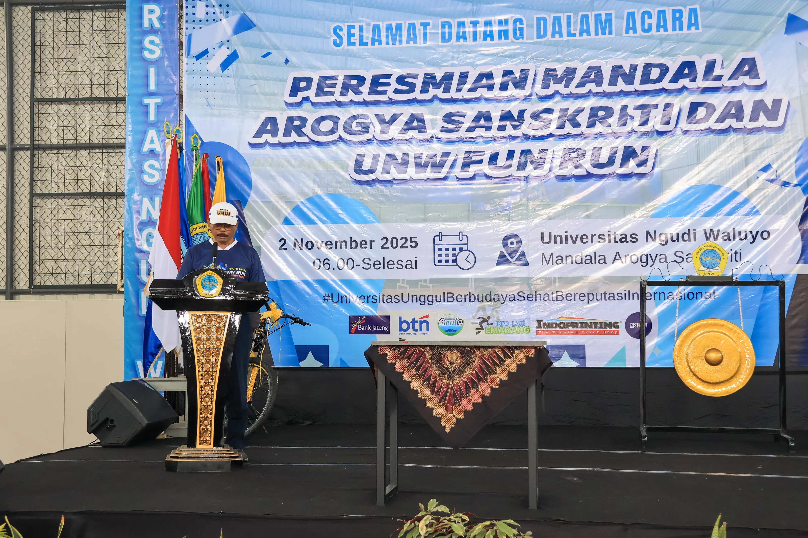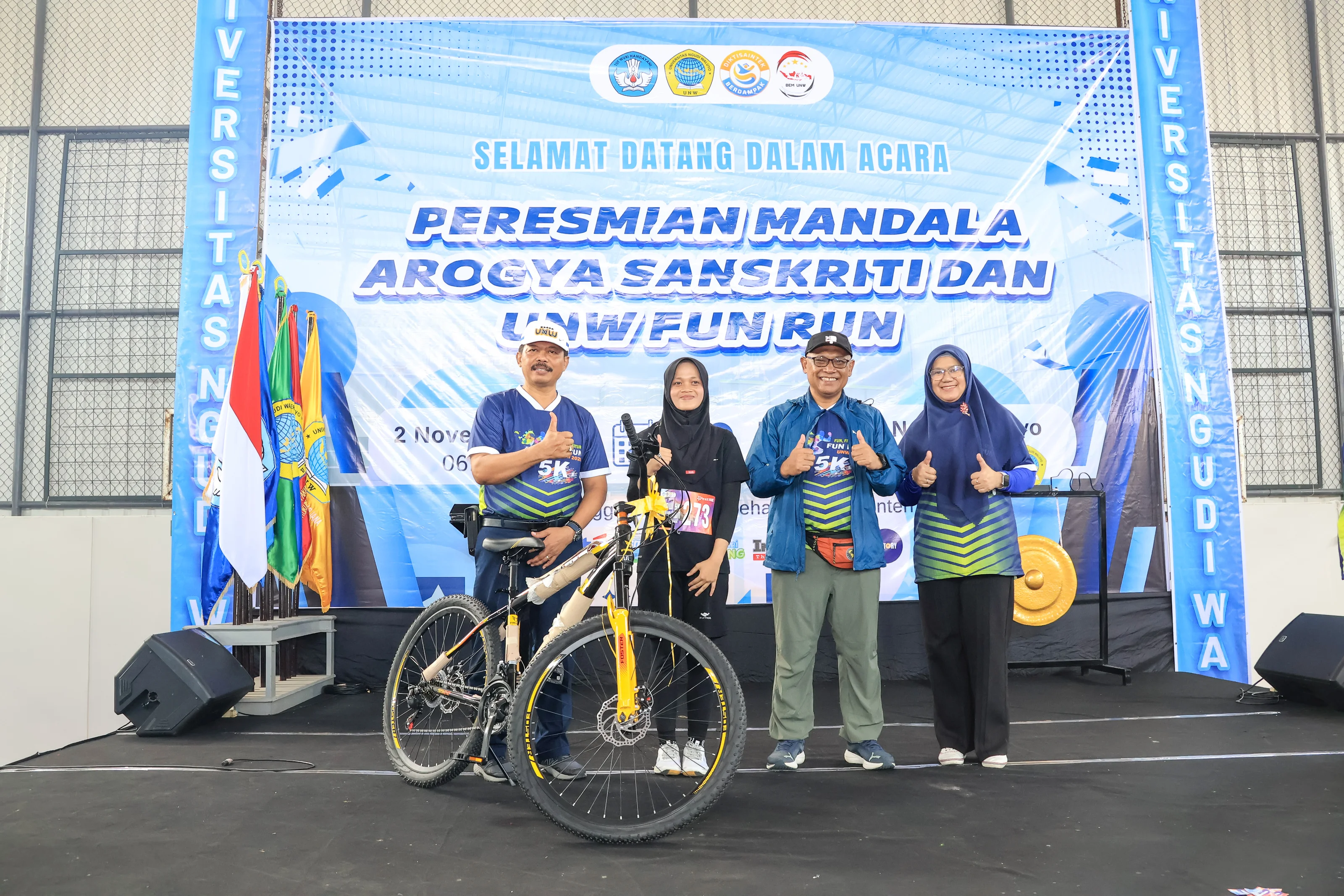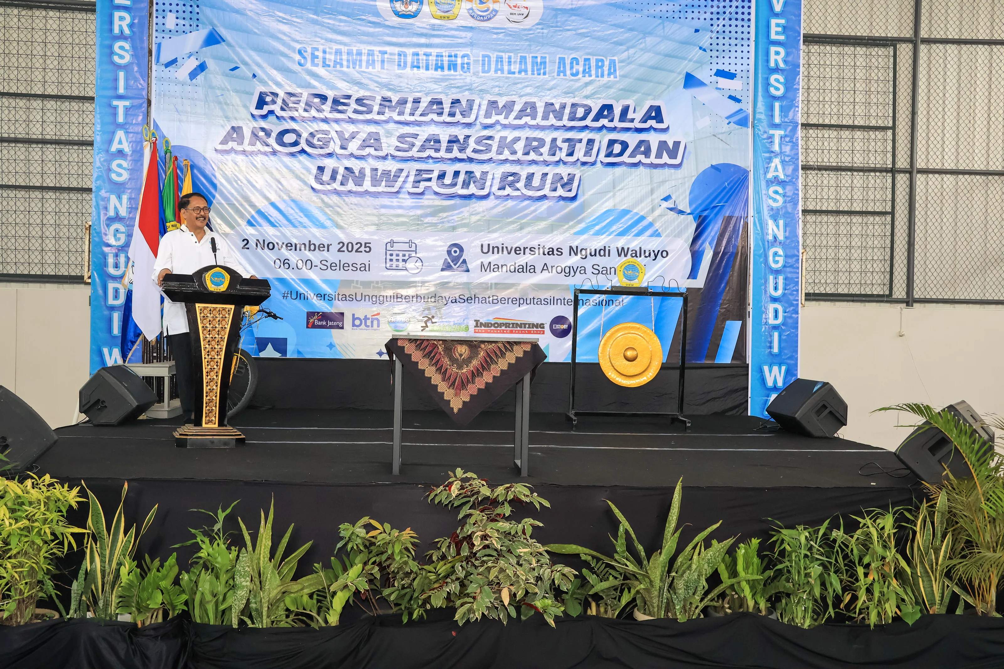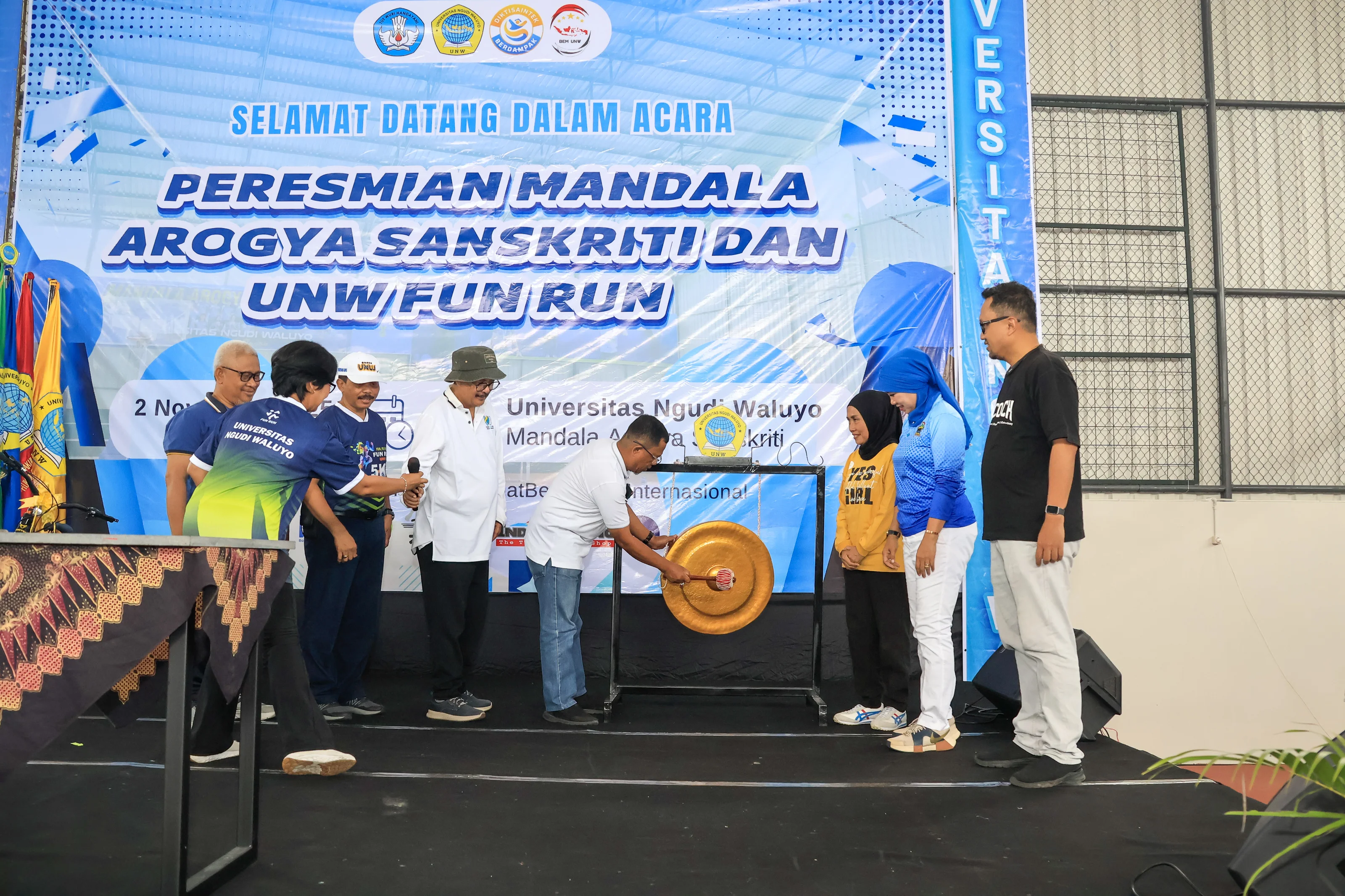 Peresmian “Mandala Arogya Sanskriti” ini ditandai dengan pemukulan gong oleh Dr. Sadimin, S.Pd., M.Eng., selaku Ketua Dinas Pendidikan dan Kebudayaan Provinsi Jawa Tengah dan penandatanganan prasasti. Kemudian kegiatan dilanjutkan dengan pembagian doorprize untuk peserta. Dengan diresmikannya Mandala Arogya Sanskriti yang merupakan nama dari UNW Health Culture Arena, Universitas Ngudi Waluyo kini resmi memiliki pusat aktivitas olahraga yang akan menjadi ikon baru kebanggaan kampus. Kegiatan UNW 5K Fun Run 2025 inipun menjadi momentum kolaboratif yang memadukan keceriaan, kebugaran, dan semangat menuju masa depan yang lebih sehat.
