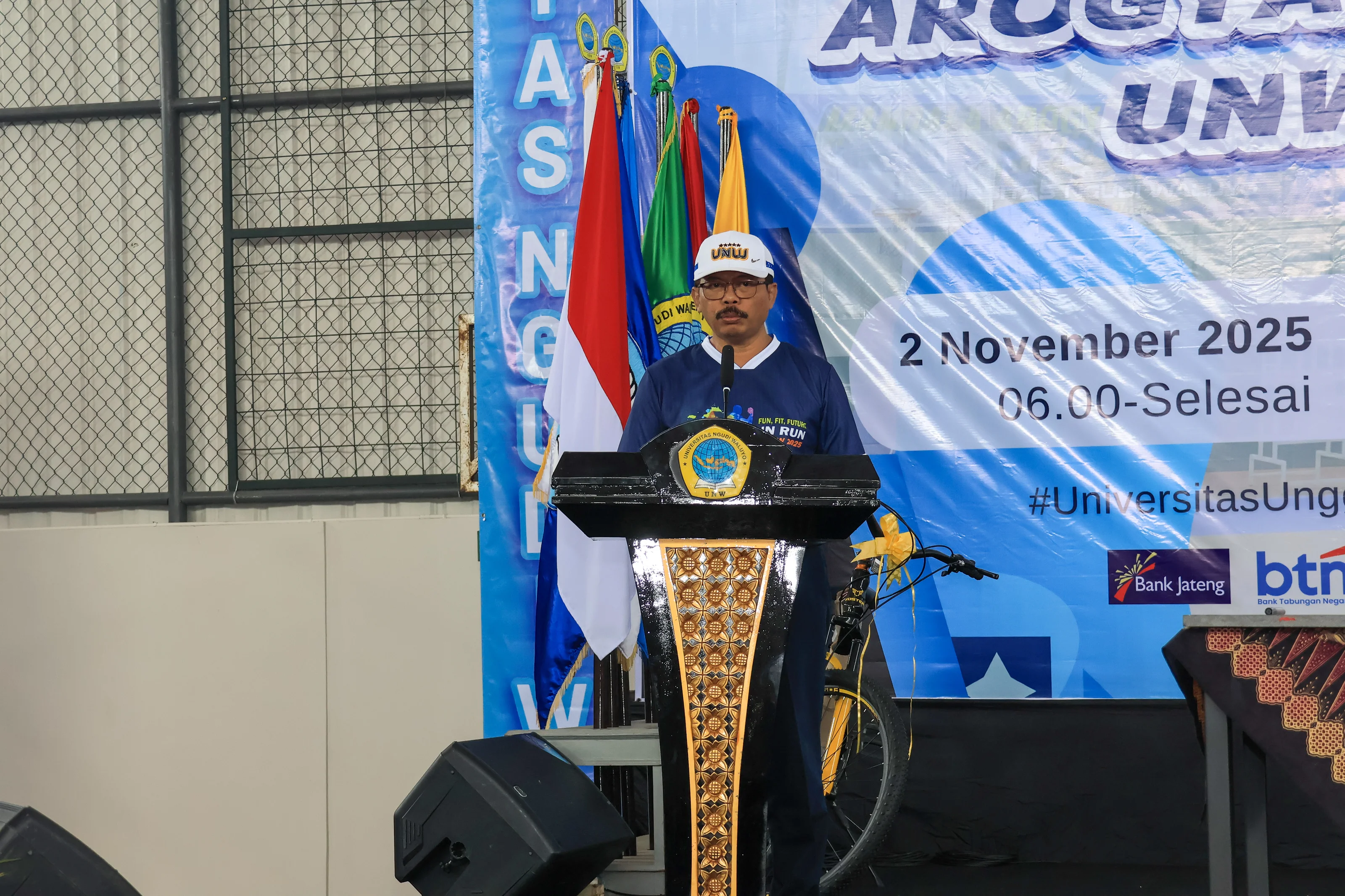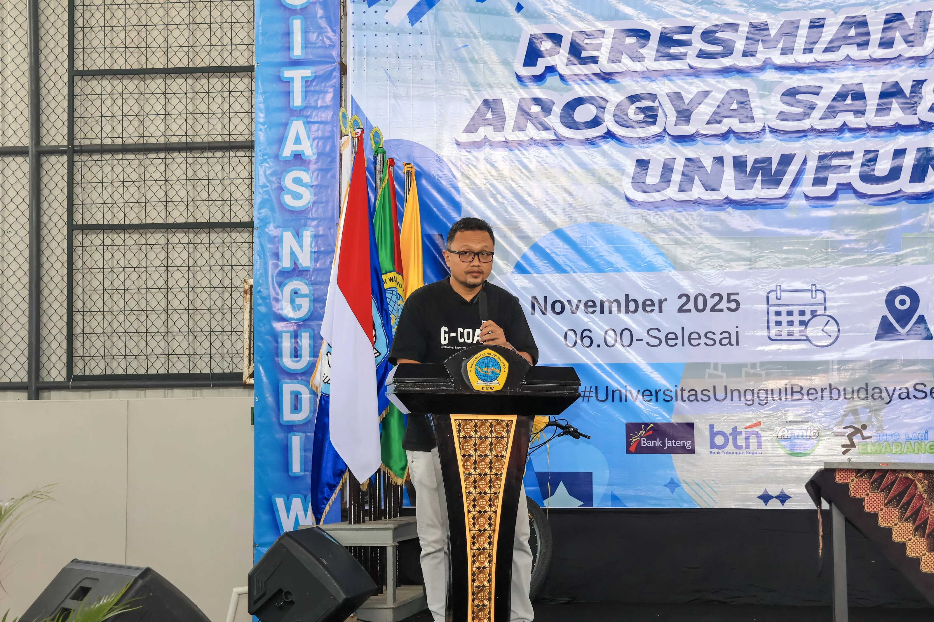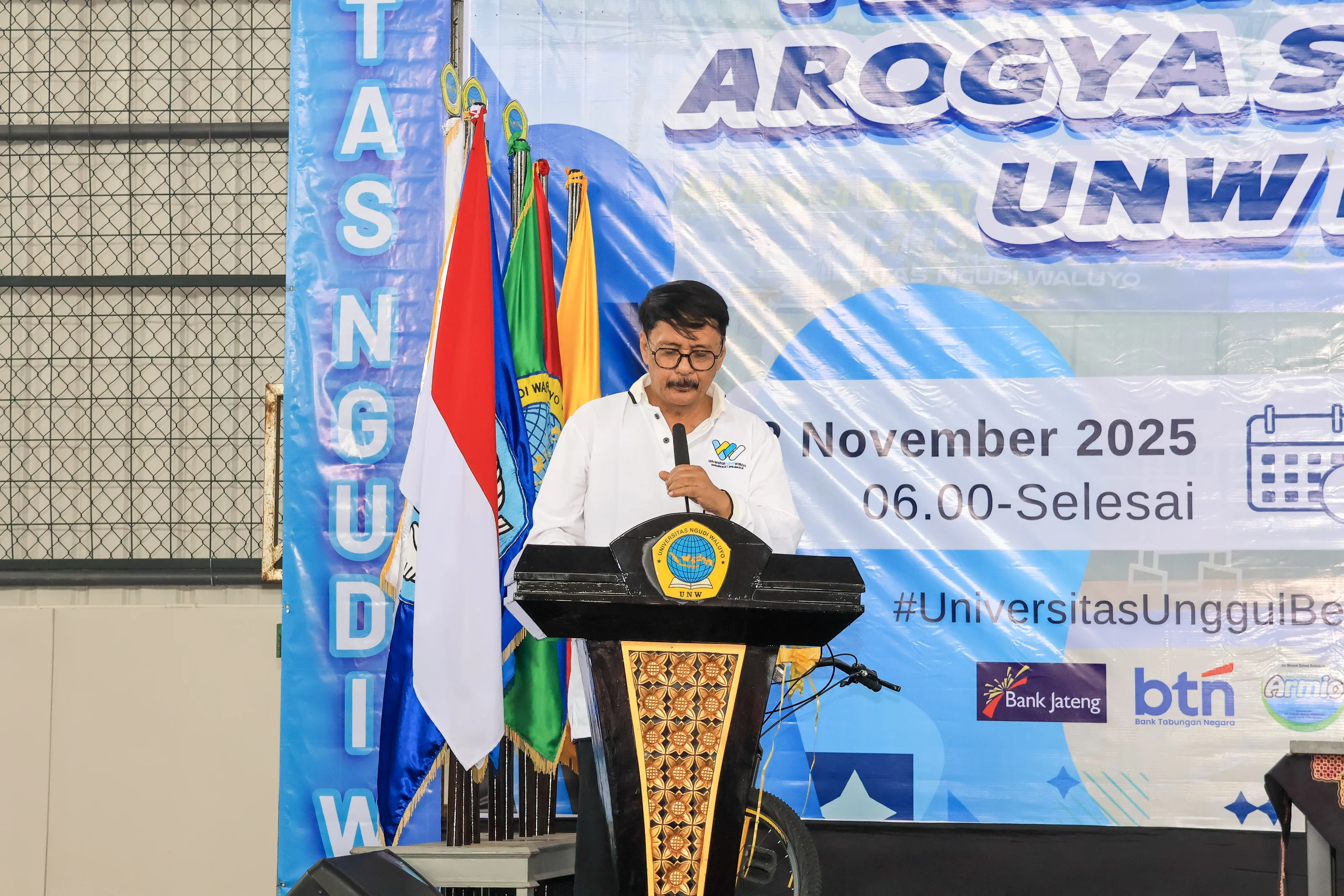 Sementara itu, anggota DPRD Provinsi Jawa tengah yang hadir mewakili Gubernur Jawa Tengah, Komjen Pol (Purn) Drs. Ahmad Luthfi, S.H., S.St.M.K., menyampaikan pesan bahwa pemerintah provinsi menyambut baik inisiatif UNW dalam membangun budaya sehat. Beliau juga turut memberikan apresiasi atas inovasi UNW dalam menghadirkan sarana olahraga yang representatif dan mendukung gaya hidup sehat masyarakat kampus. Pendidikan tidak hanya membentuk kecerdasan intelektual saja, tetapi juga membangun kesehatan dan karakter. Provinsi Jawa Tengah akan terus mendukung langkah-langkah positif seperti ini, yang sejalan dengan visi pembangunan manusia Jawa Tengah yang sehat, cerdas, dan berdaya saing.