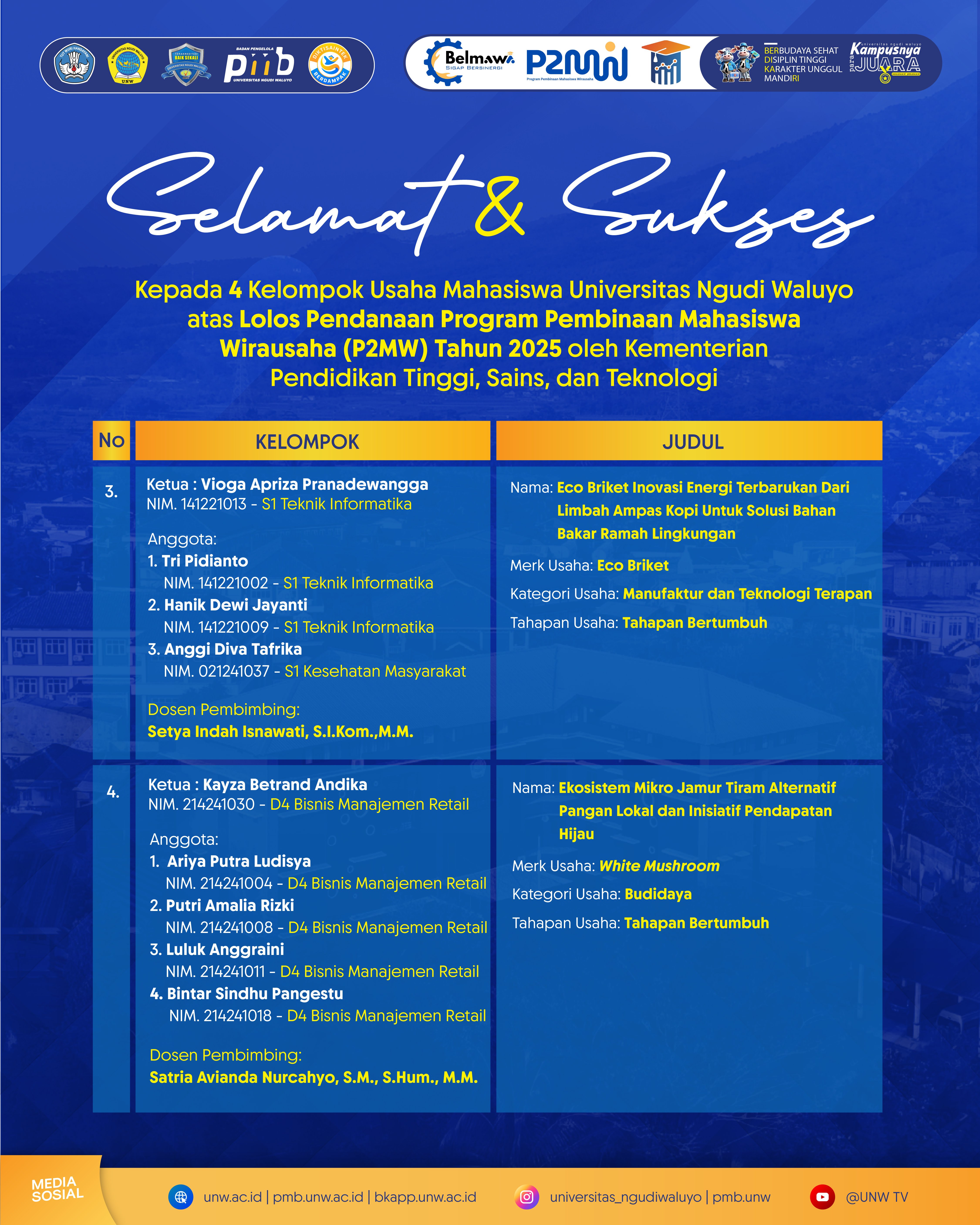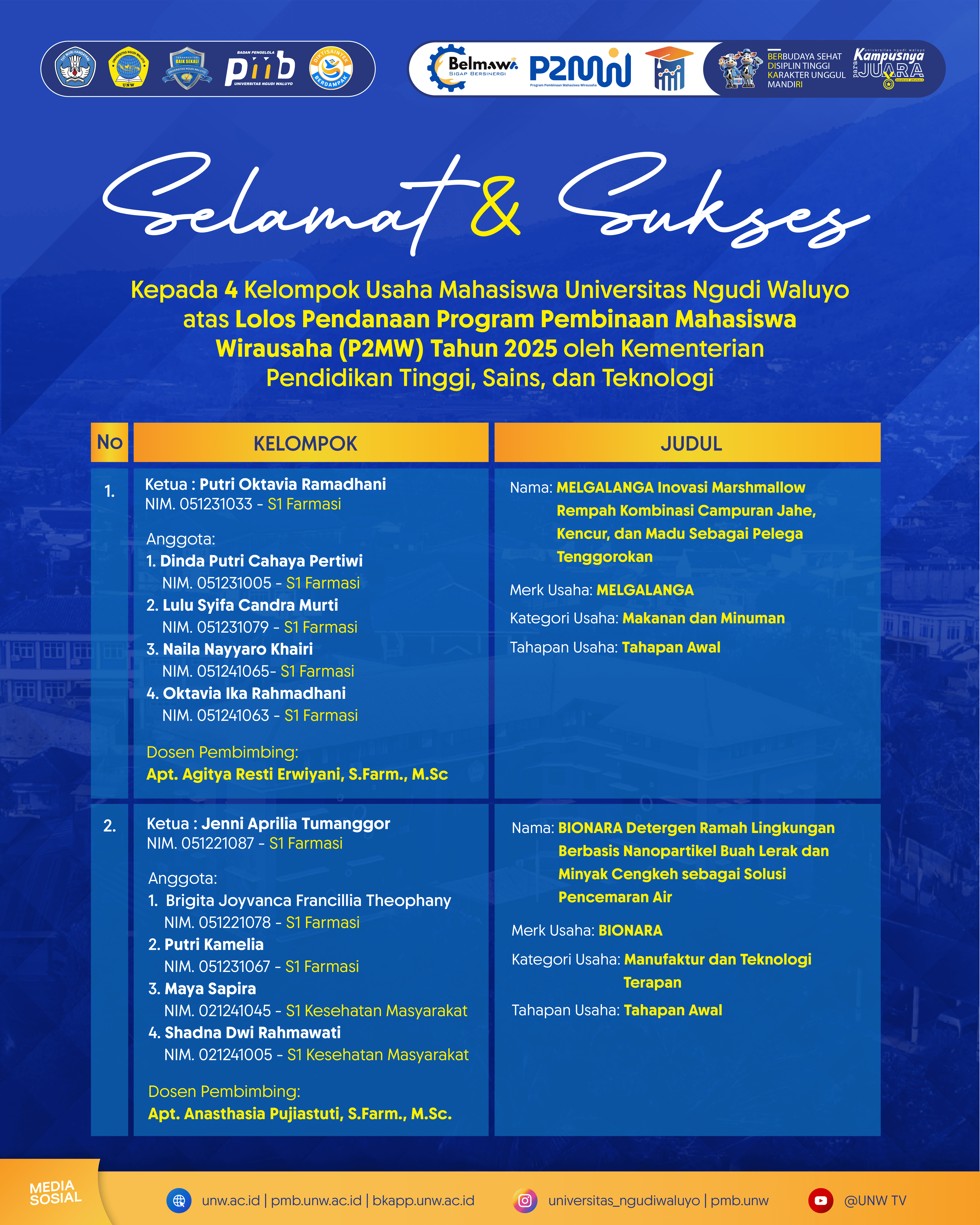 Berdasarkan Pengumuman dari Direktorat Pembelajaran dan Kemahasiswaan, Direktorat Jenderal Pendidikan Tinggi, Kemdiktisaintek nomor: 2147/B2/DT.01.03/2025 tentang Penerima Bantuan Program Pembinaan Mahasiswa Wirausaha (P2MW) tahun 2025. Puji Syukur 4 (empat) kelompok usaha mahasiswa Universitas Ngudi Waluyo, berhasil lolos dan mendapatkan pendanaan P2MW 2025.